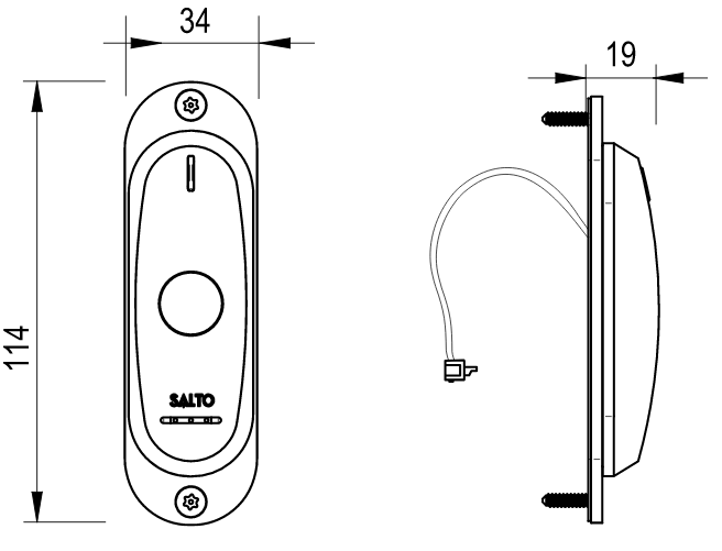 XS4 Original tanki zidni čitač za ugradnju u ravni posebno je dizajniran da stane u liftove, klizna ili elektronska vrata koja imaju uski profilni okvir i gde nema dovoljno prostora za ugradnju standardnog zidnog čitača. Nudi širok spektar beskontaktnih pametnih kartica od 13,56 MHz, za uobičajene RFID tehnologije. Sva komunikacija između nosača i zidnog čitača je šifrovana i zaštićena za komunikaciju sa opsegom kontrolera vrata CU5000. Takođe omogućavaju ažuriranje nosača putem tehnologije podataka na kartici SALTO virtuelne mreže.